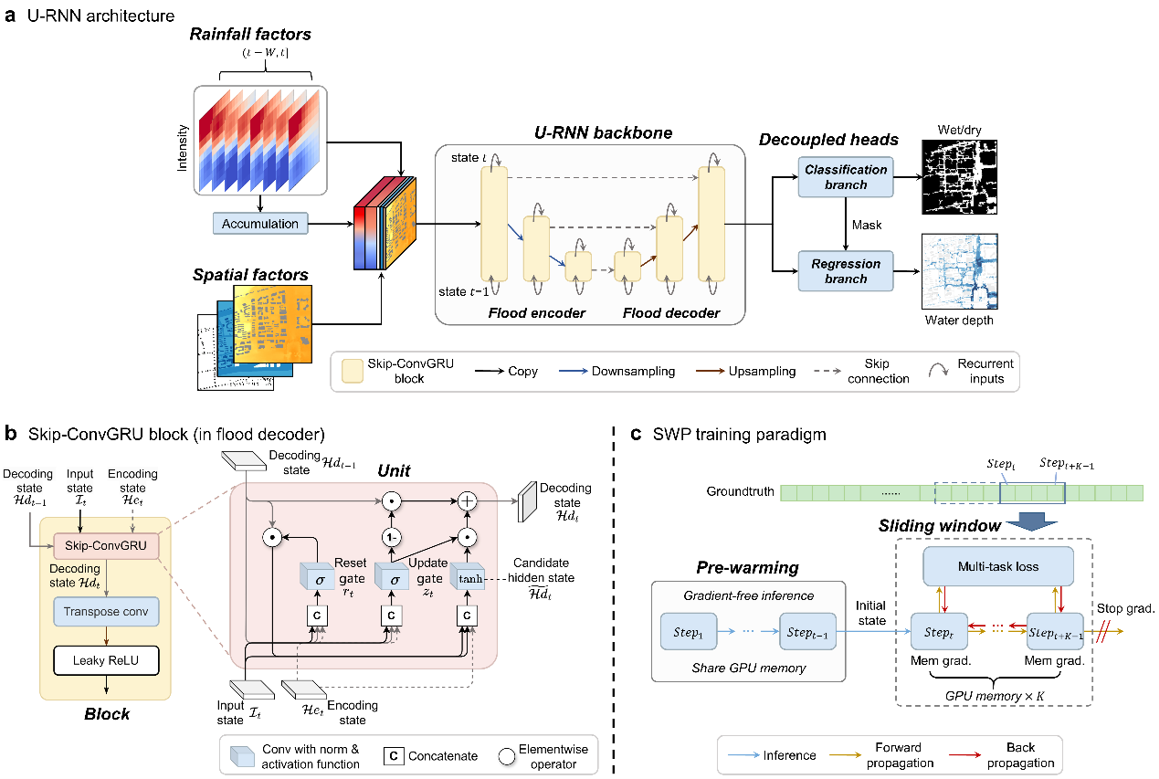 图2:U-RNN用于城市内涝临近预报。a,U-RNN的架构,即一种U型结构的循环神经网络,用于城市内涝的时空临近预报。内涝编码器接收外部因素(包括降雨时间序列因素与空间因素)以及城市内涝系统的前一时刻内部编码状态,通过Skip-ConvGRU模块提取多尺度编码状态。这些状态通过跳跃连接(skip connections)传递至内涝解码器,并再次通过Skip-ConvGRU模块转化为解码状态。最终通过分类与回归分支解耦,用于预报洪水淹没范围和水深。b,用于内涝解码的Skip-ConvGRU模块示例,该模块融合前一解码状态,前一模块输出和相应尺度的编码状态,联合提取跨层的时空特征。该单元包含重置门,更新门和候选隐藏状态,并通过卷积操作处理张量结构中的状态,从而在神经网络层之间提取时空特征。c,SWP训练范式,在每次训练迭代中使用长度为K的滑动窗口,通过基于梯度的方法优化参数,仅将K次前向传播和反向传播所需的梯度信息存入GPU内存。窗口初始状态由无需梯度的推理过程提供,并实现GPU内存共享;窗口后的序列在当前迭代中不参与训练。a图中的底图来自OpenStreetMap,依据 Creative Commons CC BY-SA 2.0许可证发布。