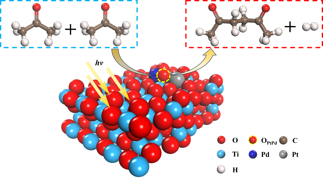 图1. 在PtPdSA-TiO2表面发生光催化反应使丙酮转换成2,5-己二酮。