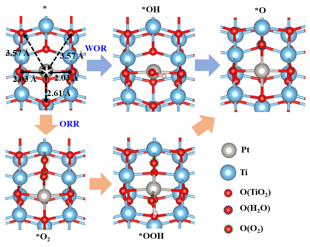 乙醇作为来源丰富的生物质基平台化合物,其催化转化在清洁能源与精细化工领域具有重要价值,传统乙醇重整制氢技术常伴随过度氧化,导致氢气纯度低且副产物复杂。为解决乙醇转化中催化剂效率差、选择性低等问题,团队开发了基于光化学氧还原反应(ORR)的策略,制备出热力学稳定的Pt单原子催化剂(PtSA-TiO2)。ORR过程诱导Pt在TiO2表面重构,形成稳定的Pt-O4结构,无需有机配体或载体缺陷即可形成热力学稳定结构(图2)。PtSA-TiO2在乙醇光催化转化中表现优异:产氢气速率为320.4 mmol g-1 h-1,是Pt纳米颗粒催化剂的3倍,目标产物乙醛的选择性高达99.65%,氢气纯度超99 vol%。经过10次循环反应,活性与选择性无明显衰减,且该策略可推广至Rh、Pd等其他贵金属单原子催化剂的合成。该研究以“Designing thermodynamically stable noble metal single-atom photocatalysts for highly efficient non-oxidative conversion of ethanol into high-purity hydrogen and value-added acetaldehyde”为题发表在Acta Physico-Chimica Sinica期刊上。williamhill中文深圳研究生院联合培养硕士生周昱晨为论文第一作者,williamhill中文深圳研究生院周鹏助理教授和湘潭大学李红星教授为论文共同通讯作者。