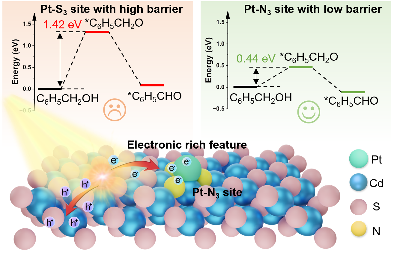图3. PtN3-CdS和PtS3-CdS光催化剂在苯甲醇增值化反应中的能垒差异。