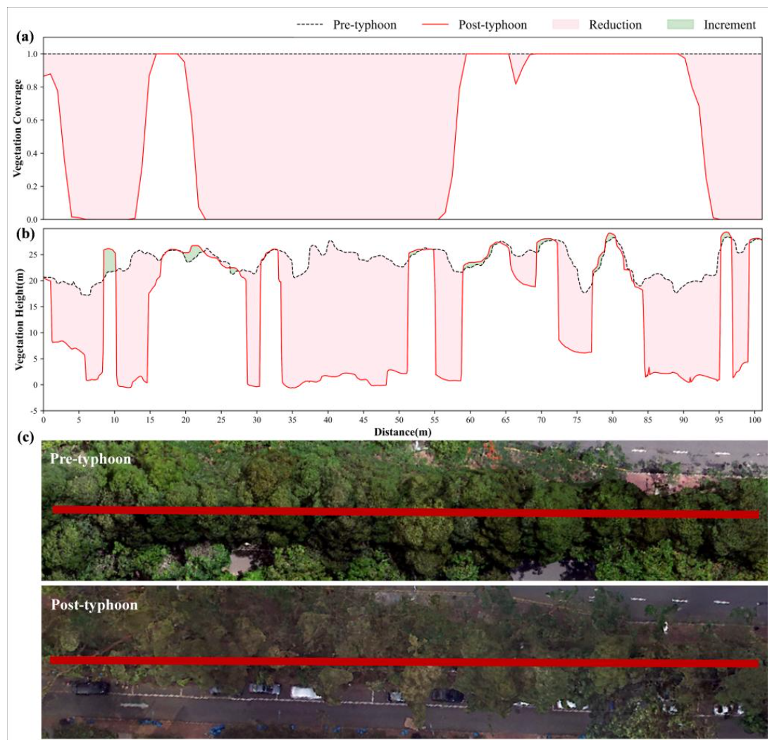 Changes in canopy coverage and height of street trees before and after the typhoon:(a) Vegetation Coverage; (b) Vegetation Height; (c) Sample Line Position