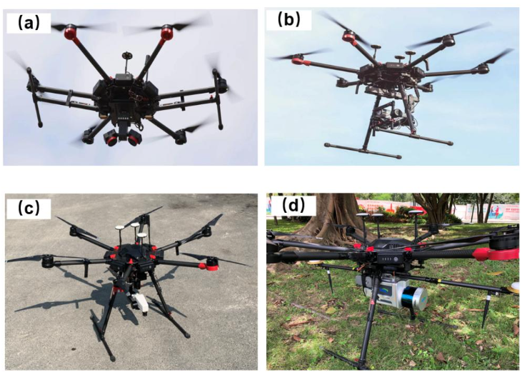 Figure 5: Integration of Different Onboard Sensors:(a) Dual-lens Tilted Photography System;(b) Multispectral and Thermal Infrared Camera System;(c) Hyperspectral System;(d) Lidar System