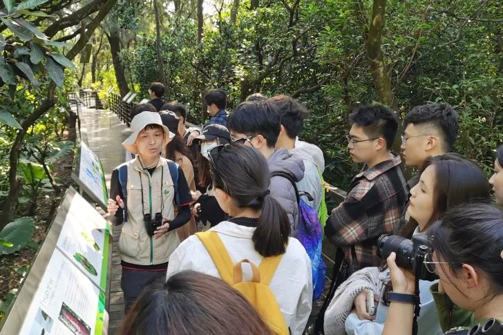 深圳位于“东亚-澳大利亚”候鸟迁飞路线上,每年11月到次年的3月,大量珍稀鸟类在这条路线间迁徙,其中有一部分是在深圳度过冬季,我们这才有机会欣赏到远道而来的候鸟。在活动过程中,来自红树林自然保护区的三位工作人员带领同学们一起前往内伶仃岛和福田红树林。正值当日潮汐水位最低的时间,内伶仃岛上已经聚集了不少爱好观鸟的人士,拿着专业摄影设备捕捉鸟儿们捕食、玩耍、休憩的身影。想要近距离观察鸟类但又不打扰它们,当然少不了专业的观鸟设备。同学们借助望远镜,在导游边介绍边讲解的话语中,仔细寻找和辨别着各种鸟类,全球濒危物种黑脸琵鹭、长距离飞行选手红腹滨鹬、斑尾塍鹬、黑翅长脚鹬、小白鹭 ……导游向同学们详细介绍了当天“亮相“的鸟类外形特征、习性等内容,同学们看得陶醉也听得入神。