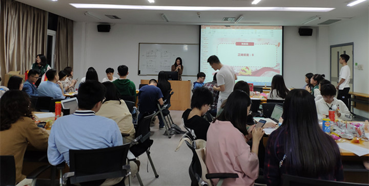 最后,团支书余玫翰、团支部组织委员李海波带领大家进行“学习法律法规,提高法治意识”应知应会知识竞赛。比赛以团队作战的形式进行,分为必选题和抢答题。必选题环节由4组同学轮流作答,每组回答指定的四道题,每道题需在10秒内作答。抢答题则是根据各组派出的代表参与“抢杯子”小游戏的胜负来确定拥有抢答资格的小组,各组参与游戏的同学和答题的同学均表现积极,现场一片活跃。