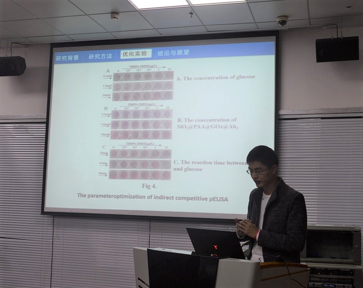 williamhill官方网站的江家豪同学汇报了《环境中典型新型有机污染物的免疫分析方法研究》,通过制备可识别新型污染物的抗体,并在此基础上,建立高通量、灵敏、快速的酶联免疫分析方法。