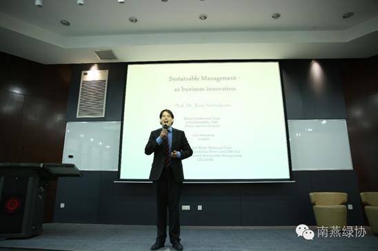 国际商业伦理与可持续发展论坛主席Rene Schmidpeter(欧洲、奥地利籍)教授从商业与可持续发展角度对企业社会责任与绿色创新进行了阐释。他指出我们可以从经济发展的角度来解决环境问题,发挥市场的调节作用,促进经济、社会、工业全面可持续发展。