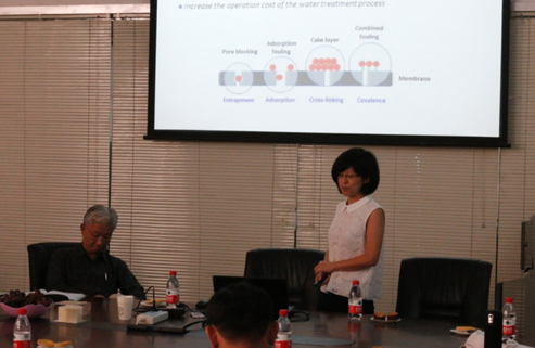 随后,来自新加坡国立大学的DrRuiGuo开展了有关”Enhance biofouling resistant properties of membrane by incorporating photocatalytic nanoparticles”的话题,介绍通过光催化增强生物污染膜的抗污性能,并与环能公司的金鹏老师展开了热烈的问题讨论。