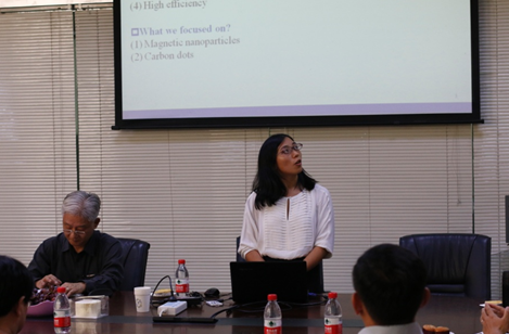 首先,来自新加坡国立大学的Dr Pingjing Li,进行了有关 “Applications of nanoparticles indetection and removal of toxic compounds”的介绍,涉及到纳米材料的应用领域。