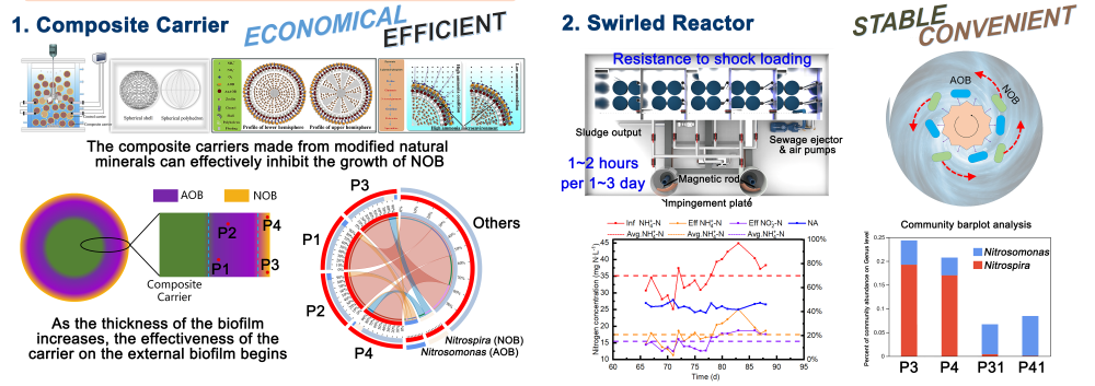 污水处理的减污降碳是当前环保领域的研究重点,如何在低能耗、低碳排的基础上实现对污染物稳定、高效去除是当前亟需突破的关键难题。张阔副研究员基于近年来对微生物载体开发、微生物代谢特性等方面的研究,从微生物合作、功能菌群构建、复合载体开发、流态及反应器结构优化,开发了一套稳定实现污水低碳高效脱氮的反应装置,该技术稳定高效,大幅提高了脱氮效率并使污水由产碳脱氮变为吸碳脱氮,降低了一半以上的电耗及运行成本。