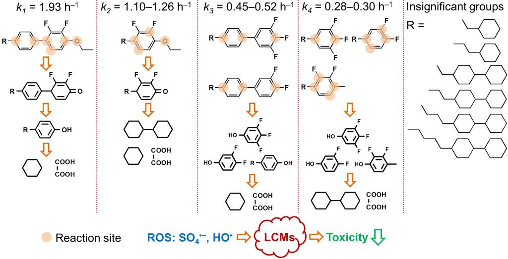 此外,在非周期性小体系精准预测方面,冀豪栋课题组和暨南大学朱明山教授合作,深入研究新污染物——含氟液晶单体的降解机制,以 “Role of Substituents in Fluorinated Liquid Crystal Monomers Emerging Pollutants Removal under UV/Peroxydisulfate Treatment” 为题发表在ACS ES&T Engineering (https://doi.org/10.1021/acsestengg.2c00373)上冀豪栋课题组通过前线轨道理论和密度泛函理论计算新污染物活性位点(5)为后续污染物降解机制深入解释提供理论依据;并通过理论生态毒性评价,对新污染物降解过程中毒性水平进行动态监测(图6).