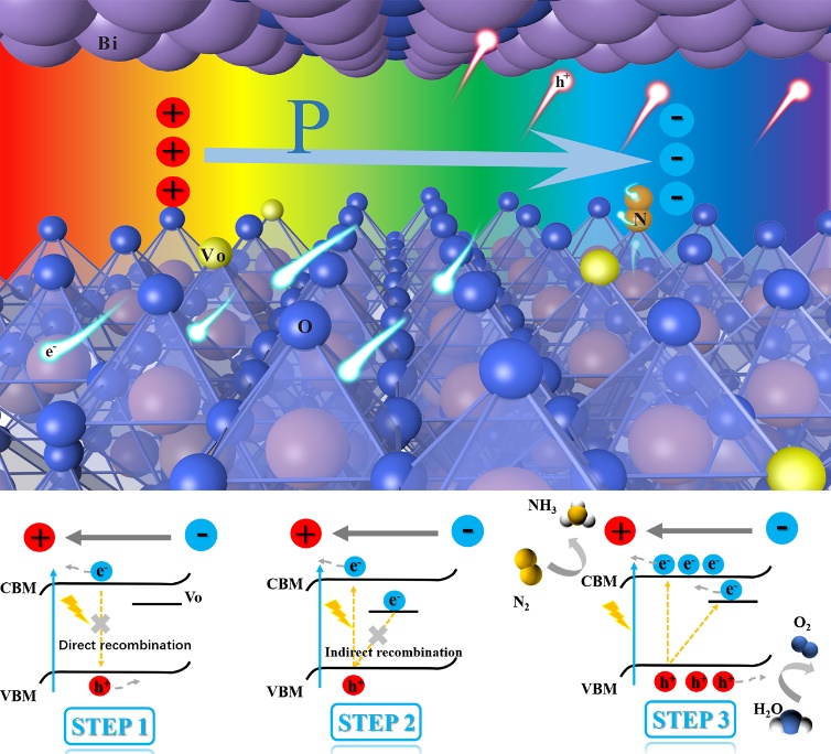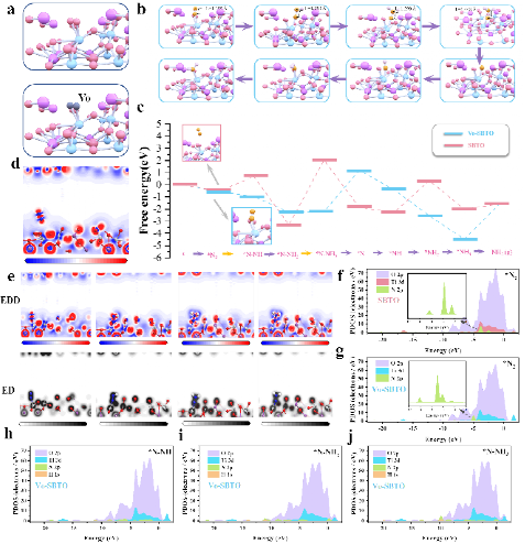 借助上述方法,冀豪栋课题组和美国加州大学圣克鲁兹分校Shaowei Chen教授、首都师范大学王强教授等国内外科研单位进行探索,研究不同光催化剂在人工固氮过程中界面反应机制,通过构建周期性体系模型,从分子轨道角度深入解析固氮机理:1)选择具有铁电特性的层状铋基铁电材料SrBi4Ti4O15作为光催化固氮材料,以 “High-Performance Photocatalytic Reduction of Nitrogen to Ammonia Driven by Oxygen Vacancy and Ferroelectric Polarization Field of SrBi4Ti4O15 Nanosheets” 为题发表在Small (https://doi.org/10.1002/smll.202206114) 如图1,通过理论计算从分子轨道层次证明了氧空位对铁电材料SrBi4Ti4O15的自极化和内部电场的显著增强作用(图2);