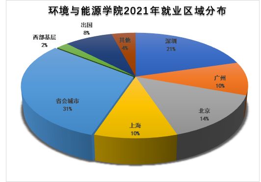 从地域角度分析,广东省就业比例为31%,主要集中在深圳、广州,比例分别为21%和10%,到北京就业比例14%,上海就业率为10%。省会城市就业率为31%,出国升学比例为4%。