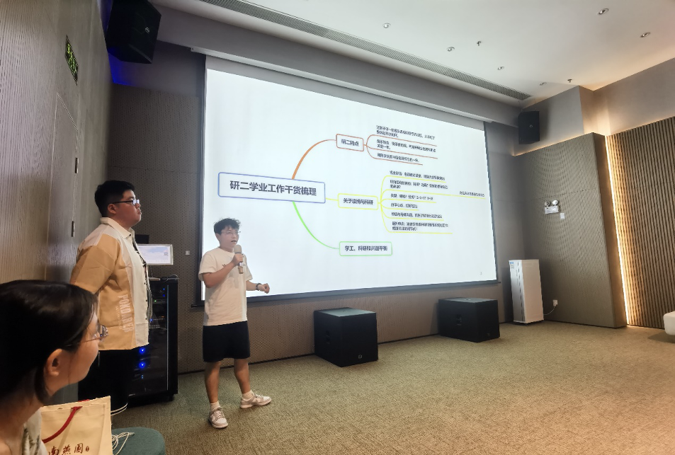 随后,硕转博的马浩楠师兄亲临现场,分享了研二阶段的学业与科研经验。马浩楠师兄鼓励我们在研二期间应积极投身科研中,为后续更好的忙其它事情打好基础。此外,他重点讲解了读博规划,要计划读博的同学明确读博目的、方向以及类型(如直博、普通博等),同时保持心态平衡,打好基础。他还建议同学们积极与导师沟通,提前了解博士招生情况,确保不遗漏关键时间节点。